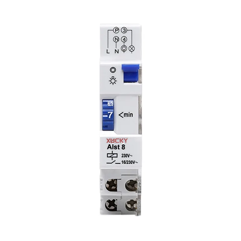 Temporizator automat de înaltă calitate XUCKY pentru comutator de lumină, un întrerupător de timp pentru scară ALST8 este disponibil pe șină DIN. Are o durată de funcționare de la 1 minut la 7 minute și este echipat cu protecție electronică la suprasarcină.